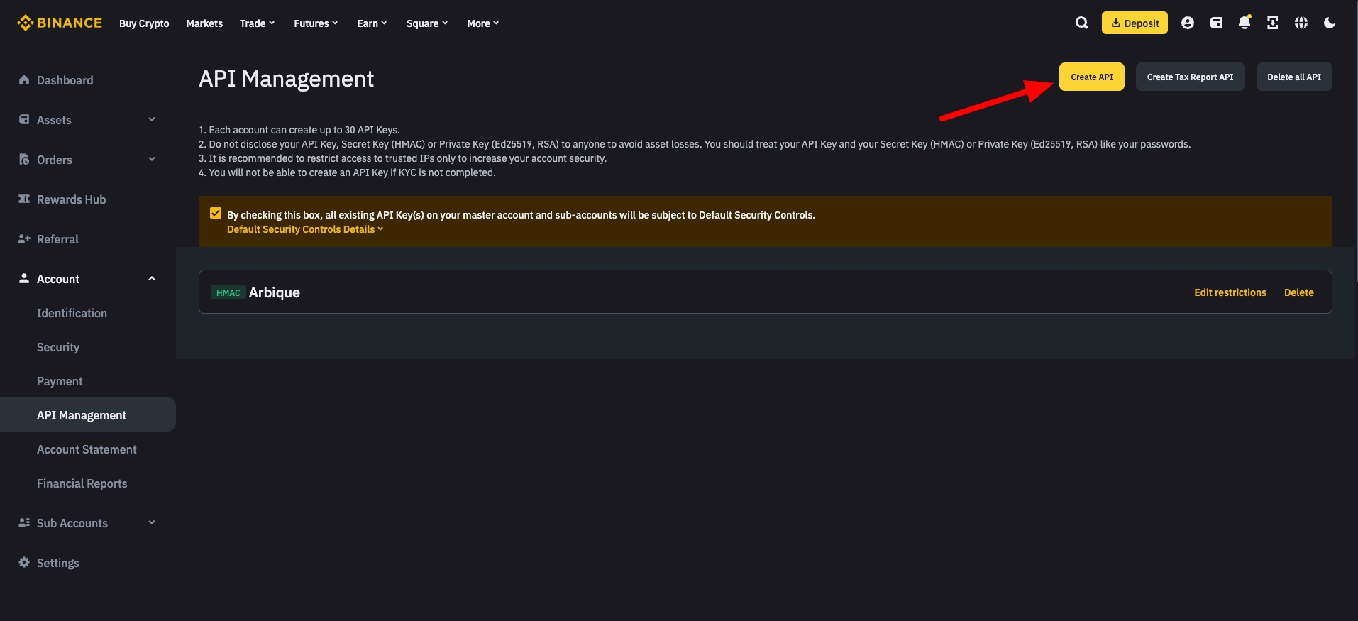 Learn more about connecting Binance API keys with Arbique. Click here learn more.
