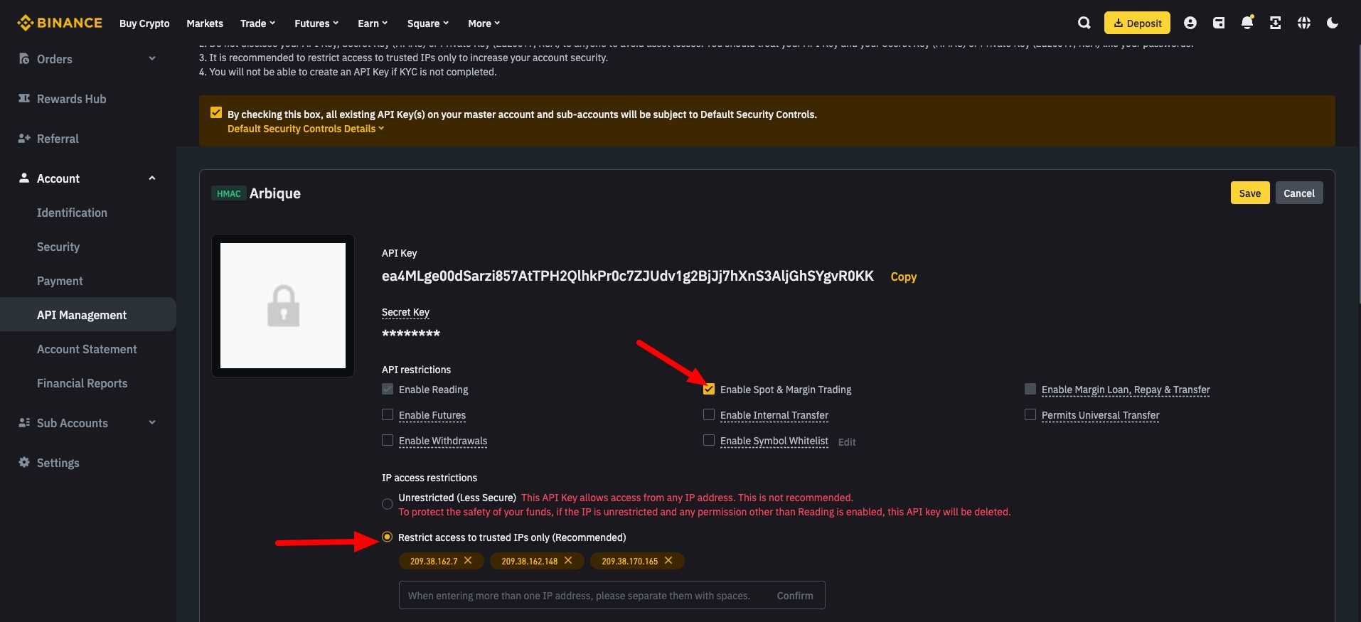 Restrict access to trusted IPs only (Highly Recommended): For enhanced security, it's highly recommended that you restrict the API key to only be accessible from specific IP addresses. This means only the servers of your arbitrage bot will be able to use these keys.
